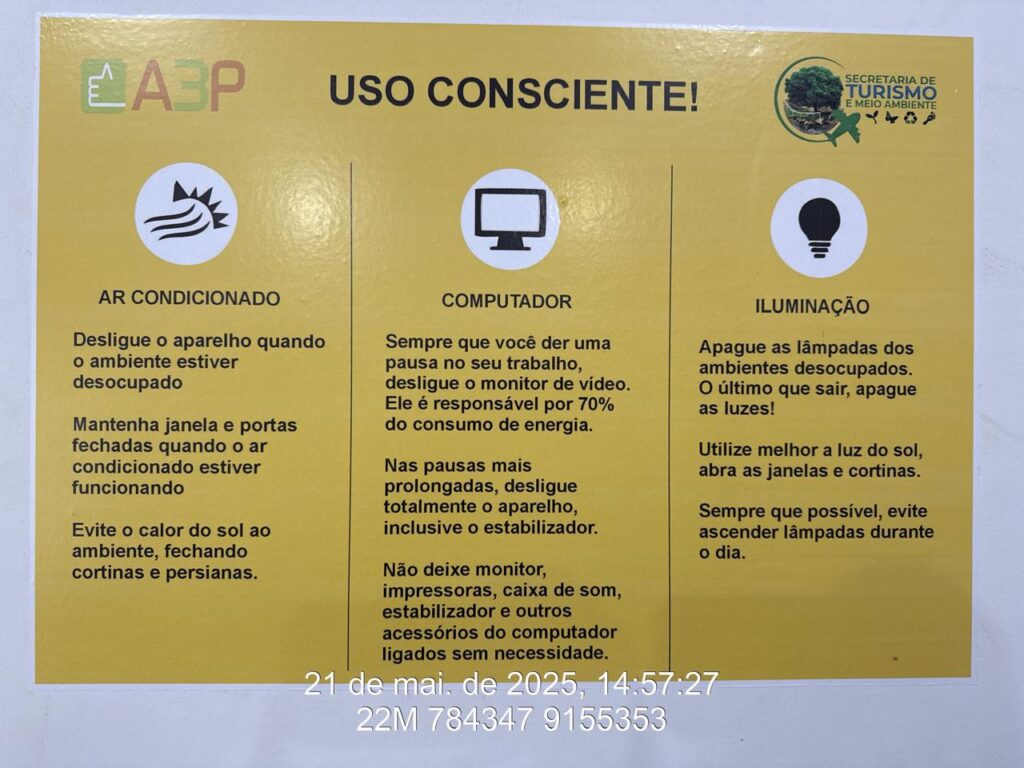 A prefeitura municipal de Nova Olinda – TO, através da secretaria de Turismo e Meio Ambiente, realizou diversas atividades em relação ao programa da A3P no ano de 2025. O programa, implementado no ano de 2024, teve como foco principal no ano de 2025, a manutenção, e substituição de informativos educacionais danificados pelo tempo e mal uso, além de reforçar a importância da utilização consciente dos recursos públicos. No ano de 2025, também foram inseridos dois novos temas para colocar em prática, referente as ações, são eles: Uso de meio eletrônico para recebimento de ofícios; e-mails, e informativos para mante as portas dos ambientes climatizados sempre fechada. A Agenda Ambiental na Administração Pública (A3P) é um programa estratégico criado pelo Ministério do Meio Ambiente (MMA) para integrar a sustentabilidade nas atividades do setor público. Sua importância fundamenta-se na capacidade de transformar o Estado em um modelo de consumo consciente e responsabilidade socioambiental, gerando benefícios econômicos e ecológicos. A relevância da A3P manifesta-se através de cinco eixos temáticos fundamentais: Uso Racional de Recursos: Reduz o desperdício de materiais como papel, água e energia elétrica, otimizando o gasto do dinheiro público. Gestão de Resíduos: Implementa a coleta seletiva e o descarte correto de materiais, minimizando o impacto ambiental das operações governamentais. Gestão de Resíduos: Estimula o mercado a oferecer produtos e serviços ecoeficientes ao incluir critérios ambientais nos editais de compra do governo. Qualidade de Vida no Trabalho: Promove ambientes mais saudáveis e seguros para os servidores, aumentando a satisfação e a produtividade. Sensibilização e Capacitação: Transforma servidores em multiplicadores de boas práticas, influenciando positivamente a consciência ambiental de suas famílias e comunidades.